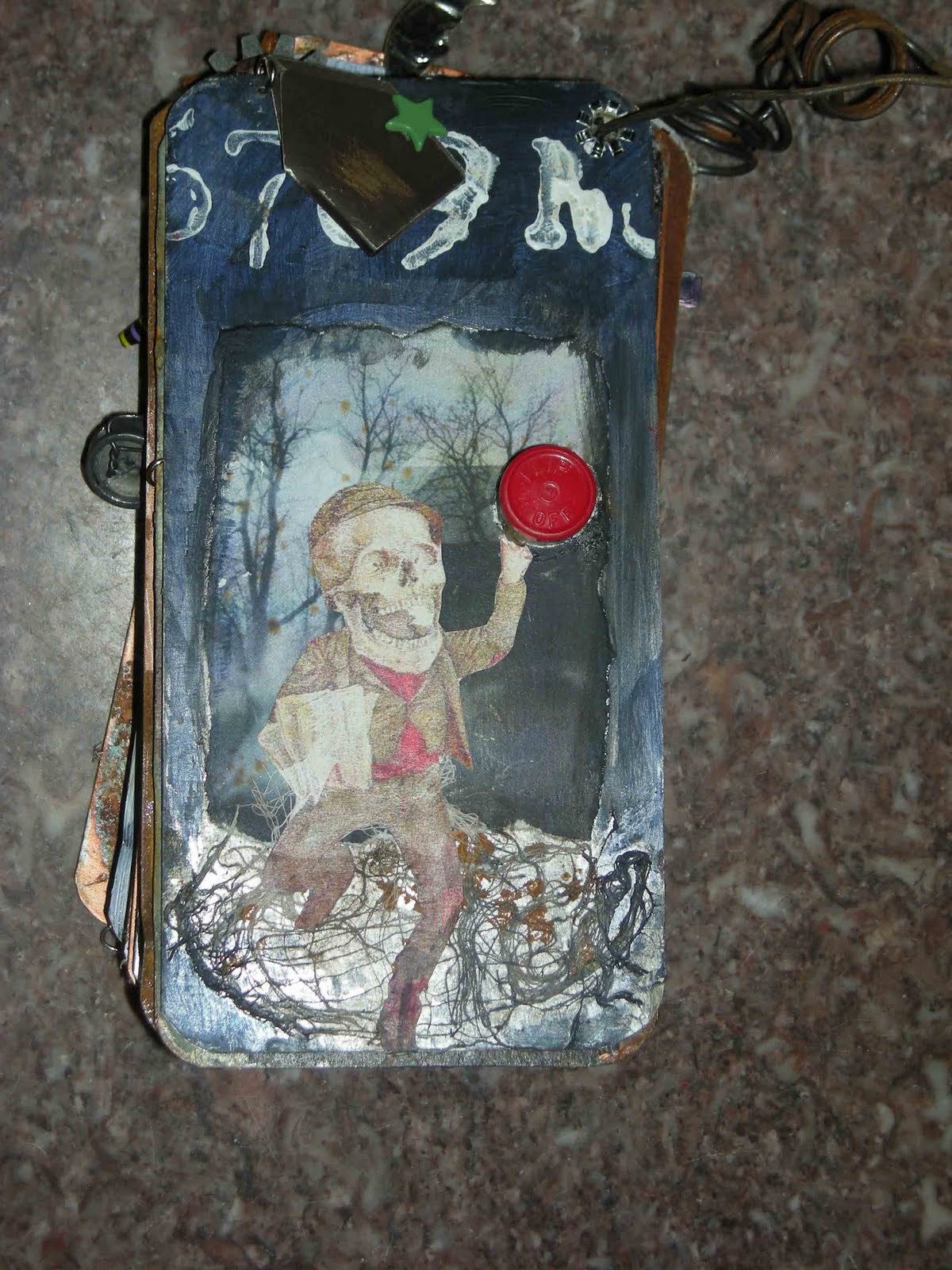 This is my cover. It started out as a simple robin. I collaged images added a nest and eggs.. it was sealed with Bullseye Amber Shellac. I added the Porkchop Show doll eyes to put some creep on.